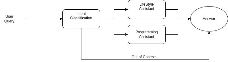 If the intent classifier labels an input query as "others", it will not be further processed by the system as shown in the figure. A graceful message should be shown to the user. Queries classified as "lifestyle" will be passed to the lifestyle assistant and similarly the "programming" labelled queries to be handled by programming assistant block.
